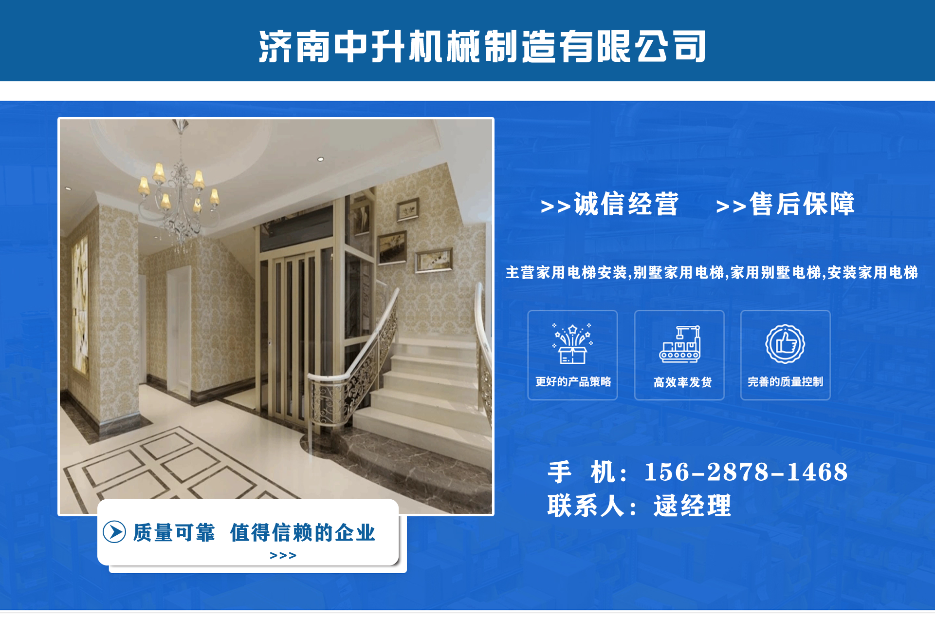 濟南中升機械制造有限公司主營家用電梯安裝,別墅家用電梯,家用別墅電梯,安裝家用電梯等業(yè)務(wù),質(zhì)量可靠,值得信賴! 公司為客戶提供免費上門測量,根據(jù)實際情況1對1服務(wù),保障符合用戶需求,終身提供售后服務(wù),讓用戶買的舒心用的放心。匠心團隊,打造信賴產(chǎn)品,我們有團結(jié)、奮進拼搏的匠心團隊,為您提供可信賴的品質(zhì)保證。 從創(chuàng)立以來一直嚴格執(zhí)行質(zhì)量管理體系、環(huán)境管理體系等相關(guān)標準管理體系,“顧客滿意”是我們始終如一的追求。我們有屬于自己培養(yǎng)的安裝隊伍,24小時服務(wù)電話,為您提供可靠的服務(wù)與支持。 我們的愿景是建設(shè)國內(nèi)具有影響力的電梯公司,做城市美好空間的好伙伴。...